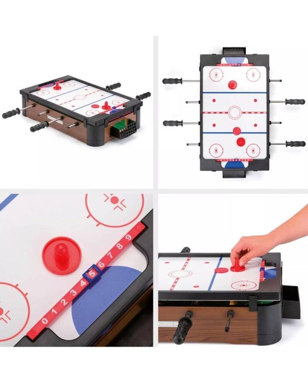 Tischfußball, Airhockey? Nein, aber Tischtennis! Mit dem PowerPlay 3-in-1 Tischspieltisch hast du alle diese Spiele in einem Rutsch! Die 3-in-1-Konsole verwandelt sich im Handumdrehen von einem Fußballtisch in eine Tischtennisplatte oder einen Airhockeytisch und wieder zurück. Mit dem mitgelieferten Zubehör können Sie sofort mit Tischfußball, Airhockey oder Tischtennis spielen. Der Mini-Spieltisch ist kompakt, tragbar und leicht zu verstauen.